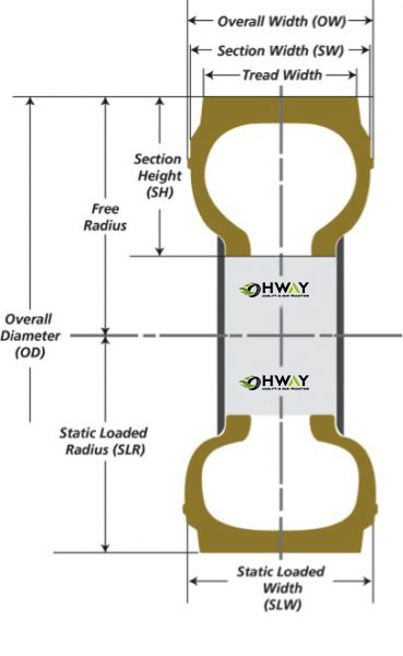 The vertical distance between the ground and the rotating axis of the tire is indicated by this parameter. It is measured at maximum load with the tire filled to its nominal pressure, properly installed on its reference rim, and according to the load index values.